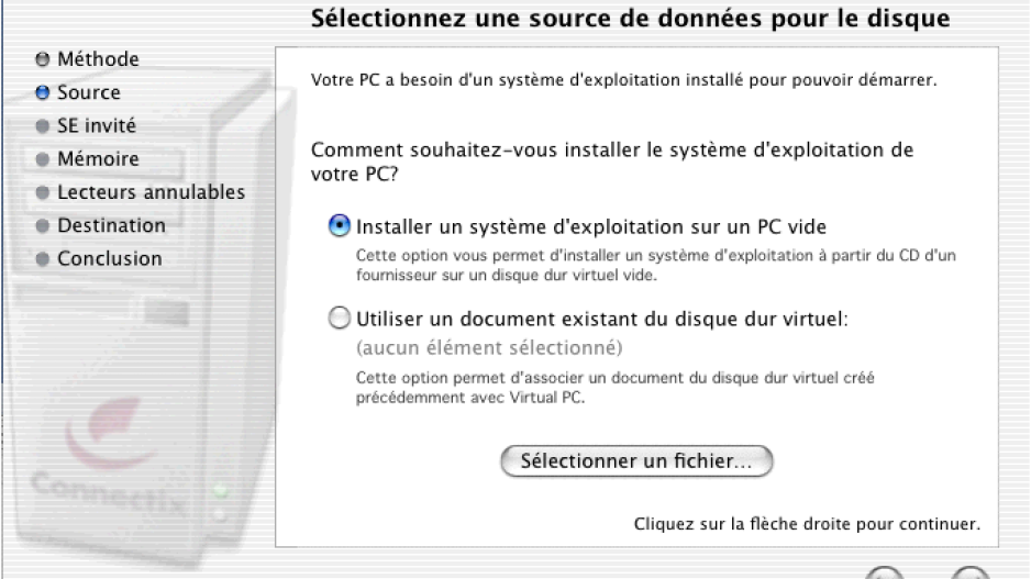 Beaucoup d'entre vous installeront Windows. Alors attention. Tout d'abord, sachez que si vous désirez installer Windows XP, VPC ne gère pas encore le NTFS. Ensuite, la VRAM que nous avons paramétrée avant ne veut en aucun cas signifier qu'une carte graphique accélératrice est émulée mais qu'il y a seulement de la mémoire vidéo d'allouée (comme sur les vieilles cartes mères). Il est donc absurde d'installer VPC pour jouer aux jeux gourmands en 3D. Les vieux jeux en 2D ou ne demandant qu'un support DirectX seront jouables à la rigueur mais gardez en mémoire que VPC reste avant tout un outil de travail et d'échange.