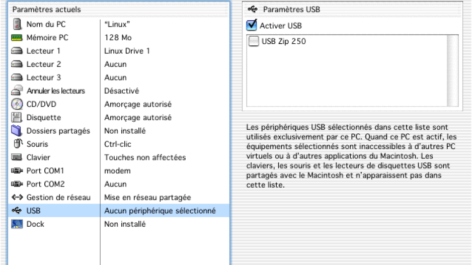 Activez le support usb si vous avez des périphériques et qu'ils vous serviront dans l'utilisation de votre PC. Le support usb 1.0 est vraiment bluffant, je n'ai pas encore trouvé de périphériques non reconnus (tant que l'on a les drivers pour le système de son PC virtuel).